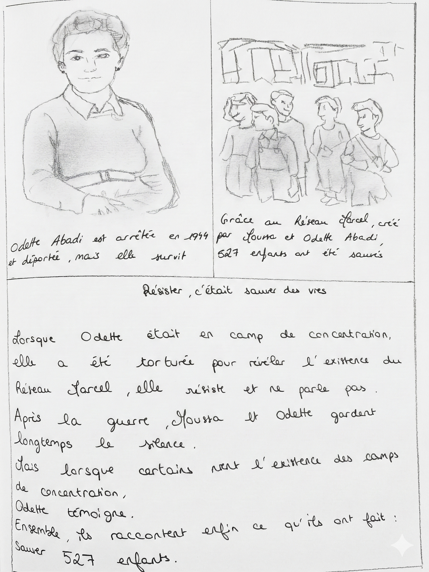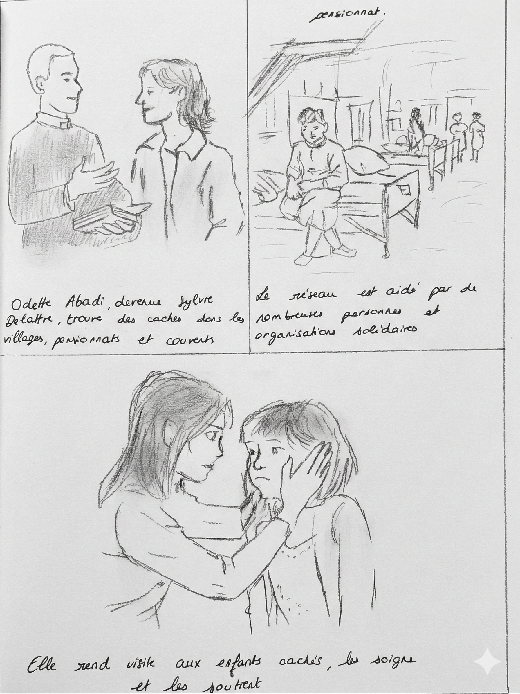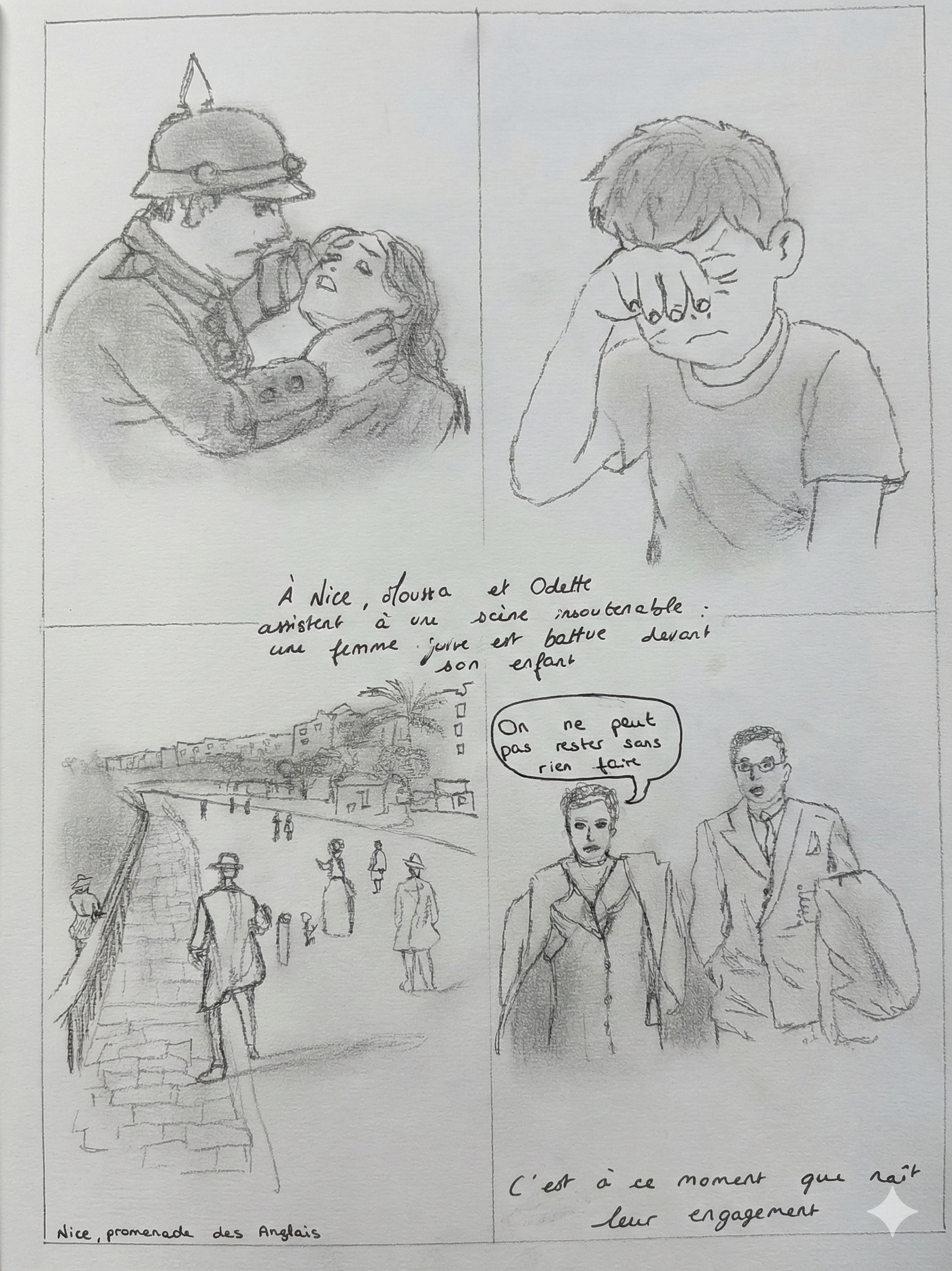 Raconter Odette, Moussa, les Pasteurs Gagnier et Evrard, Mgr Rémond, leur faire vivre Nice et son occupation successivement Italienne puis Allemande, parler du racisme, de l'antisémitisme, de solidarité, d'éthique, d'enfance. Ils me questionnent sur celle-ci, bien sûr ils s'identifient, et soudain, ils me voient comme la petite fille de l'époque : nos émotions se conjuguent.