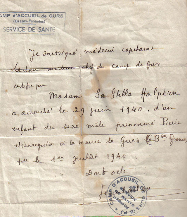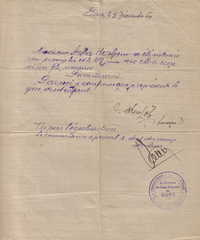 Ce n’est que récemment, profitant des loisirs que donne la retraite et de mon activité de bénévole à l’OSE que j’eus l’envie de mettre un peu d’ordre dans les papiers que m’avait laissés ma mère et dans les correspondances qu’elle avait entretenues avec ma fille Ariane et mon fils Jerôme. Dans un document signé du chef d’escadron DAVERGNE, commandant le camp de Gurs, il était écrit que ma mère était autorisée à sortir du camp de GURS le 17 juillet soit dix neuf jours après ma naissance accompagnée de son enfant et de regagner son lieu de résidence qui était soit NICE ou MANDELIEU. On ne peut que faire des suppositions sur ce geste de mansuétude, un geste d’humanité ou un manque de consignes des autorités pour ce genre de cas (naissance) ou de garants exterieurs (mes grands-parents).